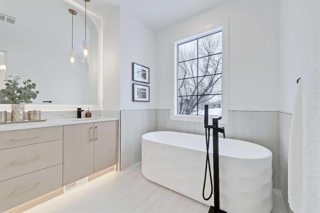 Clean lines, layered neutrals, and a magazine-ready kitchen come together in this modern PARKDALE INFILL home that feels calm the moment you step inside. The palette is soft and sophisticated, the hardware is warm, and every surface reads effortless. It’s designed for real life, with spaces that flow and finishes that stand out. You enter to a defined foyer with a closet for coats and sightlines across the wide plank engineered hardwood and high ceilings. Sightlines pull you forward to the heart of the home where the kitchen, dining, and living connect in one easy sweep. The kitchen is an entertainer’s dream: full-height cabinetry, a large quartz island with seating, warm fixtures, and integrated upgraded stainless steel appliance package & POT FILLER. The quartz features subtle golden veining for an elegant touch of luxury, and the slab backsplash maintains a sleek and easy-to-clean look. Across from the island, a generous dining area sits under designer lighting, making family dinners feel special even on a Tuesday. The living room is designed for a cozy and modern setup, oriented towards a fireplace feature with vertical wood clad tile that is sure to impress. Large windows draw in natural light and frame the backyard and vinyl deck. The rear mudroom with built-ins for shoes, backpacks, and sports gear makes daily life simple and organized, keeping the main level looking photo-ready. Upstairs is laid out for privacy and quiet retreats. The primary suite is a true haven, featuring a sky-high 11-ft ceiling, tall windows, a large walk-in closet, and a serene ensuite finished in warm stone tones. Enjoy a double vanity, walk-in shower w/steam, and elegant fixtures that match the home’s modern feel. Two additional bedrooms share a stylish full bath, and the laundry room is exactly where you want it. The lower level adds incredible flexibility w/ a LEGAL 2-BED SUITE (approved by the city), allowing you to use it as a mortgage helper or mother-in-law suite! Thoughtfully finished like the rest of the home, this space features a full kitchen with quartz counters and a stainless steel appliance package, a full 4-pc bathroom with a fully tiled tub/shower combo, and a dedicated laundry room. Location puts you in that sweet spot on Calgary’s northwest side with quick access to the BOW RIVER PATHWAY for runs and dog walks, and an easy connection to Edworthy Park. Groceries, coffee, and everyday errands are close at hand along 16 Ave and in Kensington, with more retail at Market Mall. Commuting is simple with nearby routes to downtown, and you’re minutes to Foothills and the Children’s Hospital, the University of Calgary, and the West Hillhurst Community Association for rinks, fitness, and programs. Well-regarded schools serve all ages, transit is convenient, and weekend life is dialed with parks, playgrounds, and local restaurants within a short drive. It’s understated luxury. Warm, modern finishes. Functional spaces that make daily life feel organized and elevated.